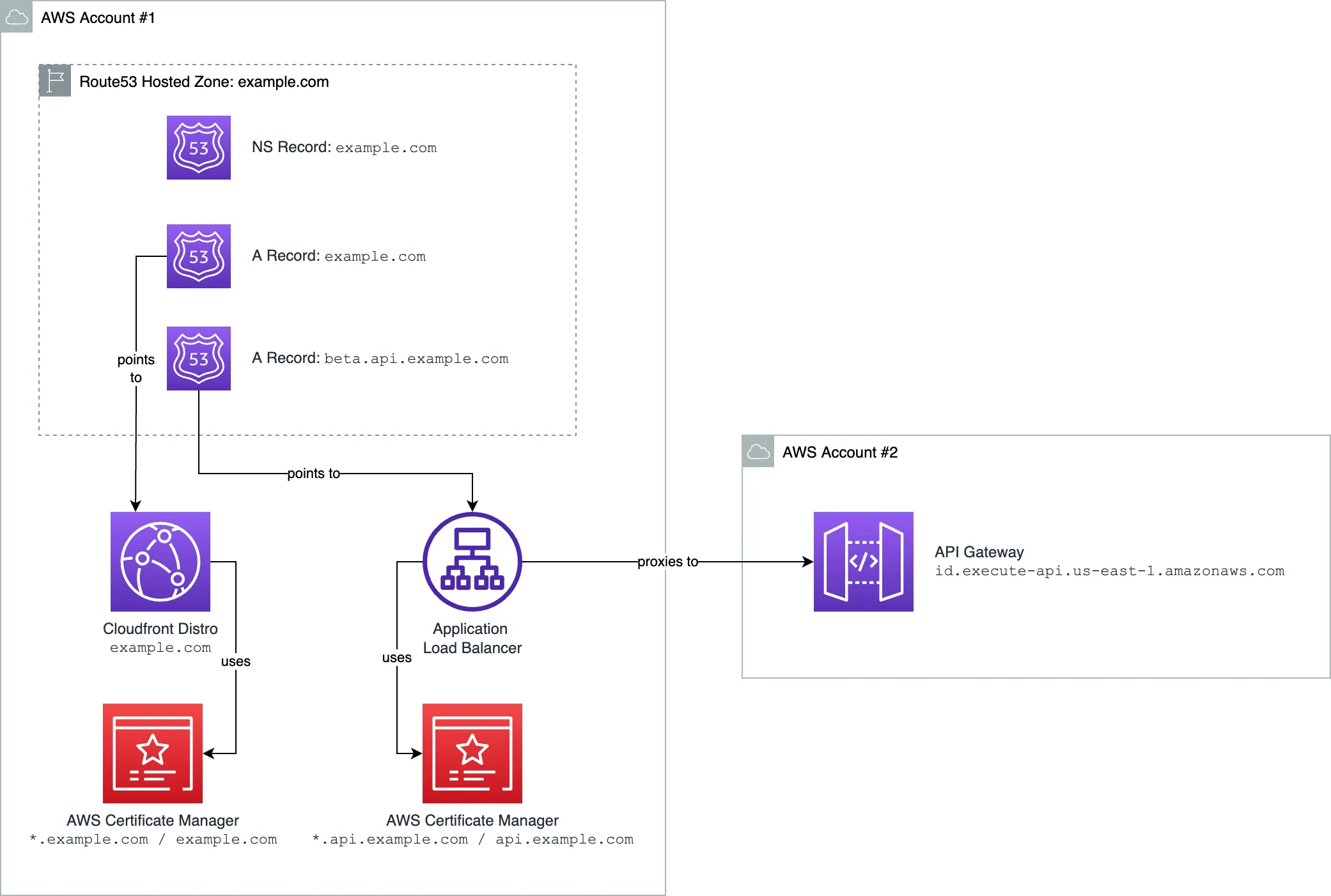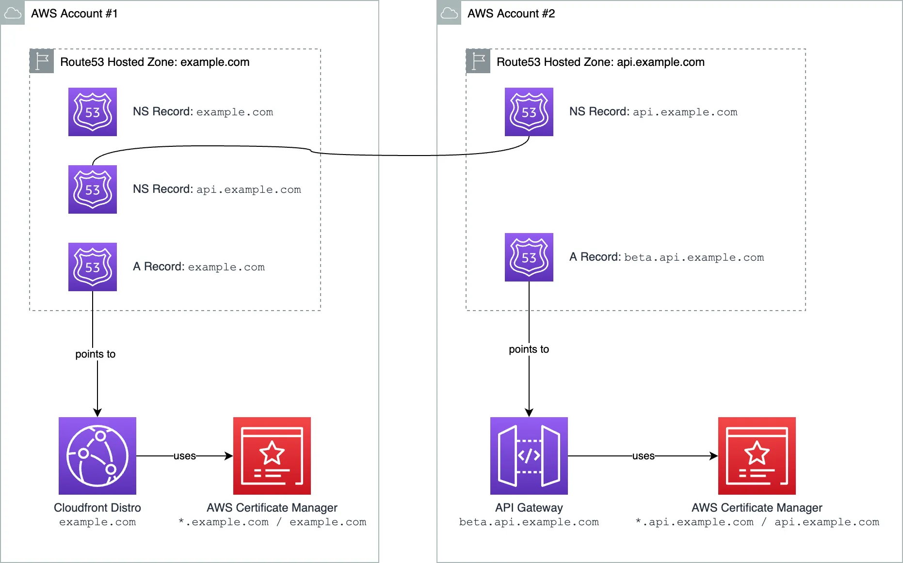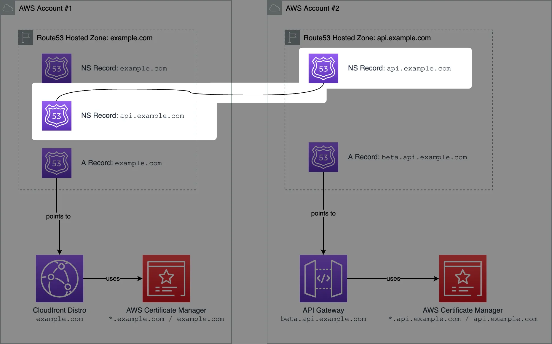 Imagine you have a single AWS Account where you have your domain example.com. AWS Route53 hosted zone is created for that domain in AWS Account #1. You have a Cloudfront distribution pointing to example.com that hosts your website.