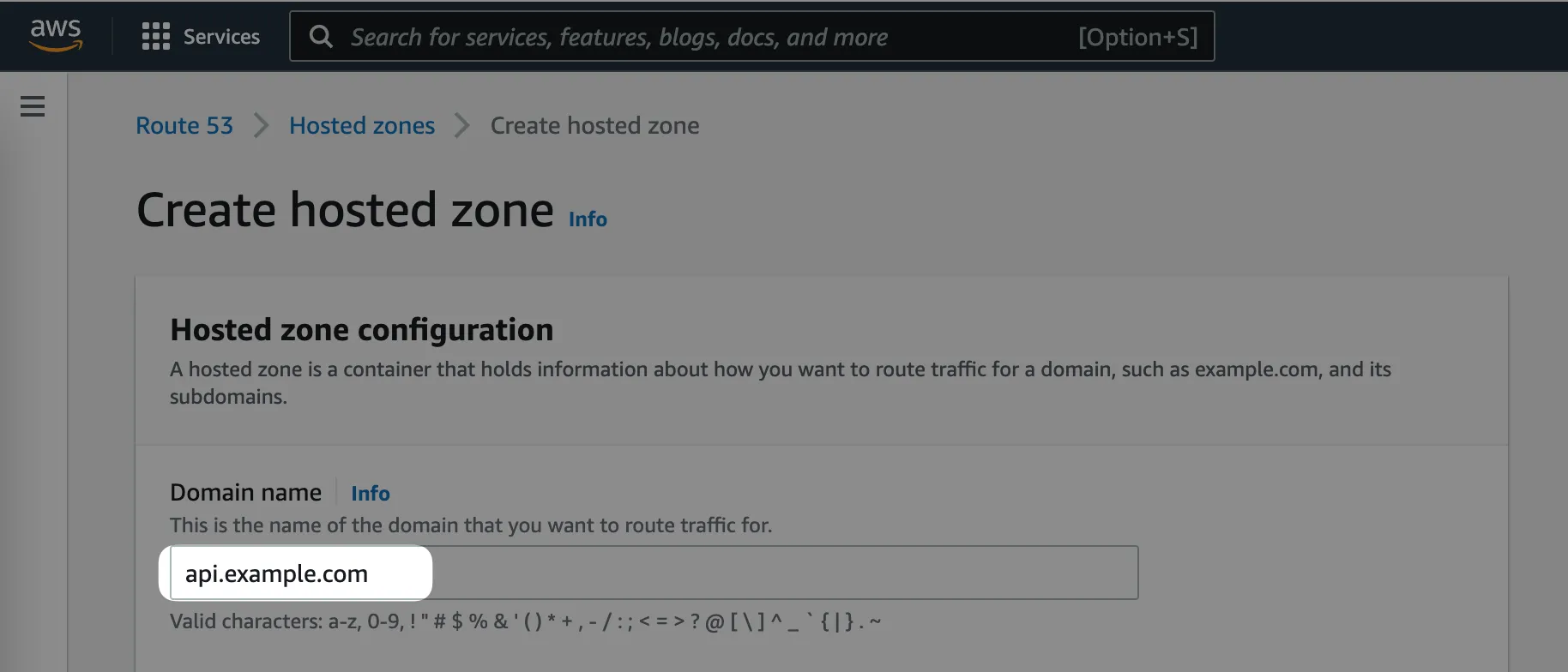 In our case, we want to create a hosted zone for the api.example.com domain.
