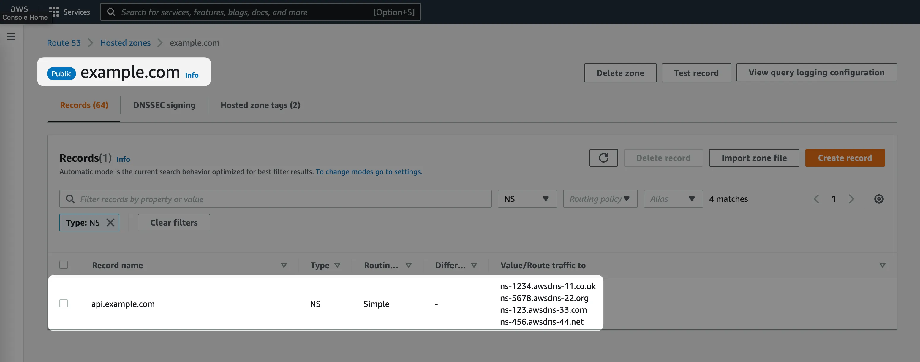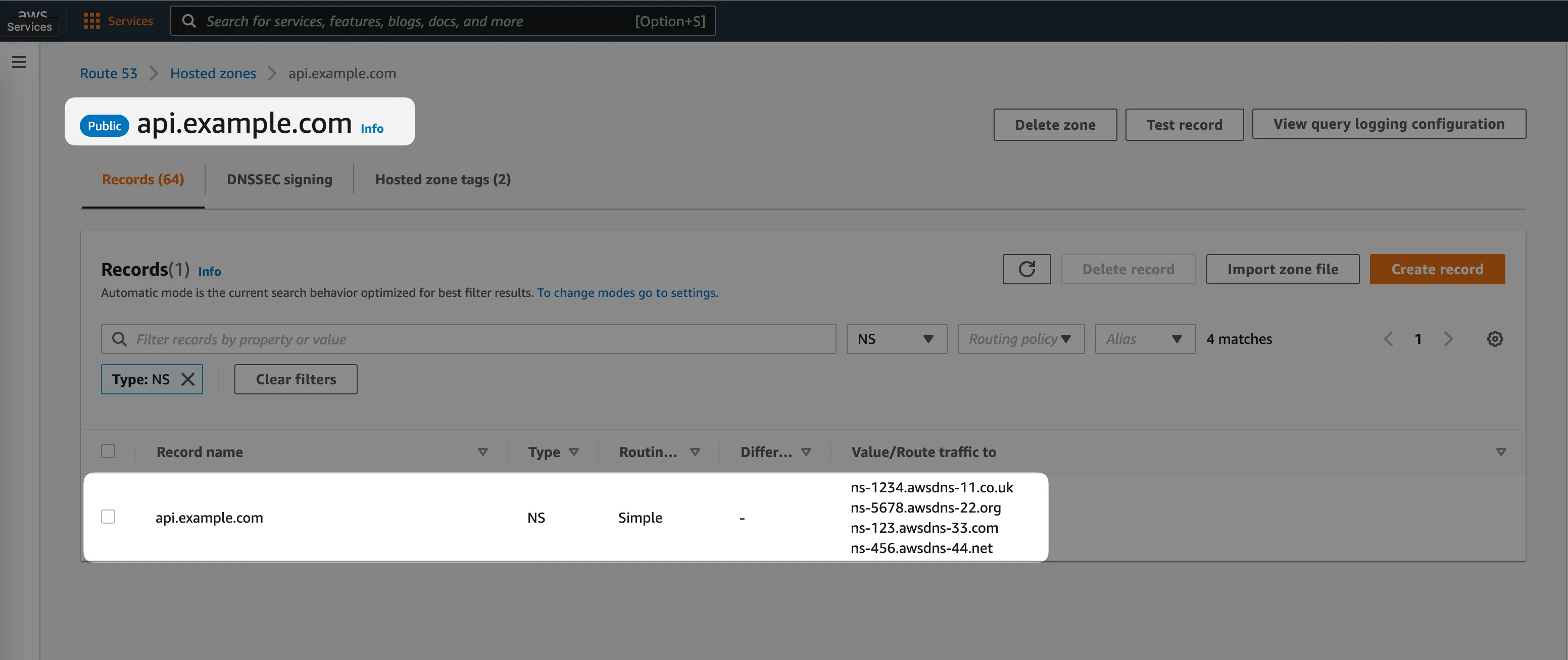 Now we need to let DNS know, that all the DNS queries to the api.example.com or *.api.example.comrecords should be handled by a different AWS Route53 hosted zone.
