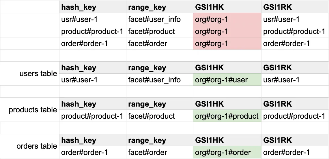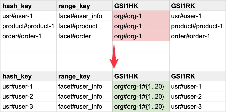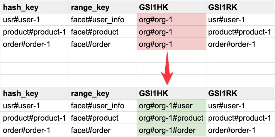For example, if your original GSI partition key is GSI1HK=org#{orgId}, you can modify it to include the facet, like GSI1HK=org#{orgId}#product, GSI1HK=org#{orgId}#user, and GSI1HK=org#{orgId}#order.