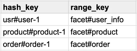 Consider the same example as in the previous section. Another approach is to avoid single-table design pattern and store different facets in separate tables.